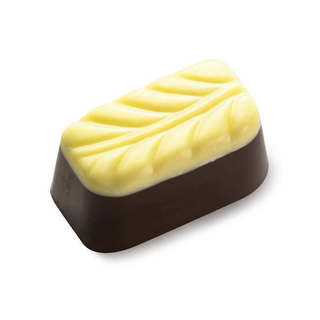 Dark chocolate with black tea flavoured creamy centre decorated with white chocolate.