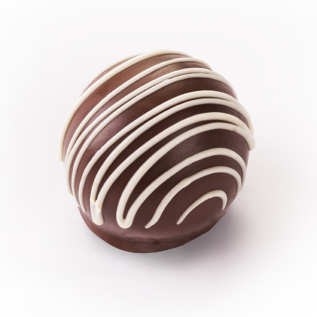 A traditional truffle made with dark chocolate and cream decorated with a white chocolate lattice.