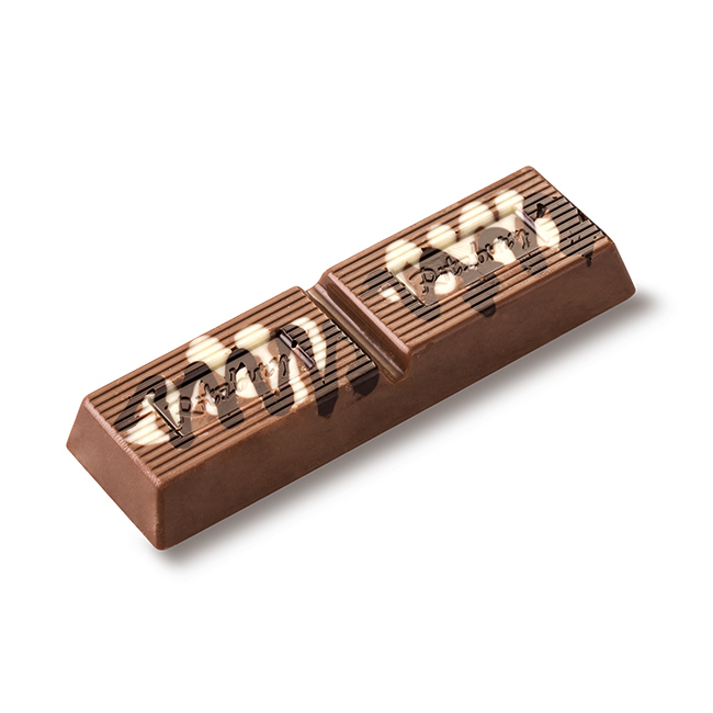 Our signature milk chocolate bar decorated with dark and white chocolate.